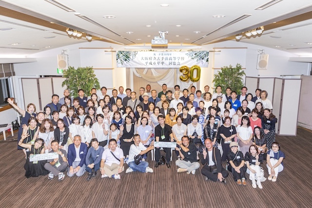 卒業30周年を記念して、令和6年8月17日(土)にKKRホテル大阪にてH6年卒学年同窓会を開催し、約100名が集いました。会場からは、大阪城と母校の姿を望むことができました。